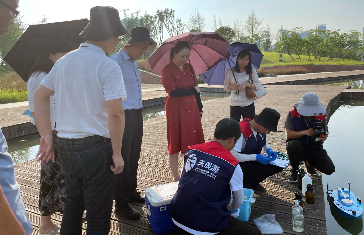 會后,蔡曉芳副總裁一行來到天晟源環(huán)保駐天府新區(qū)成都直管區(qū)項目組參觀湖庫水質監(jiān)測工作,項目組負責人蔣定邦介紹了天晟源環(huán)保作為天府新區(qū)掛牌的環(huán)境監(jiān)測站的主要工作內容和自主研發(fā)的初代無人采樣船的制作工藝及引申功能。在興隆湖環(huán)境空氣采樣、道路交通噪聲監(jiān)測、酸沉降(大氣降水)項目現(xiàn)場,蔡曉芳副總裁聽取了監(jiān)測人員對監(jiān)測設備和道路交通噪聲監(jiān)測點位布設原則的介紹。她表示,項目組研發(fā)使用的無人船能夠有效提升工作效率、保障人員安全,這樣的創(chuàng)新精神值得鼓勵和推廣。調研中,蔡曉芳副總裁等領導多次贊揚天晟源環(huán)保工作人員在夏季高溫環(huán)境中不怕苦、能吃苦的工作態(tài)度,展現(xiàn)了天晟源環(huán)保人昂揚的精神態(tài)度。