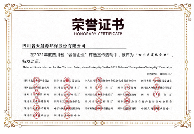 在以公司總經(jīng)理張恒同志為首的公司經(jīng)營管理團隊帶領下,天晟源環(huán)保自成立以來,堅持以人為本,著力構建和諧勞動關系,公司經(jīng)濟效益和社會效益得到了全面發(fā)展,公司先后獲得成都市“守合同重信用”企業(yè)稱號、中國環(huán)境保護產(chǎn)業(yè)協(xié)會企業(yè)信用評價AAA等級、國家稅務總局四川省電子稅務局納稅信用狀態(tài)評價A級等眾多誠信榮譽,具有極高的社會信譽認可度及行業(yè)誠信贊譽度。