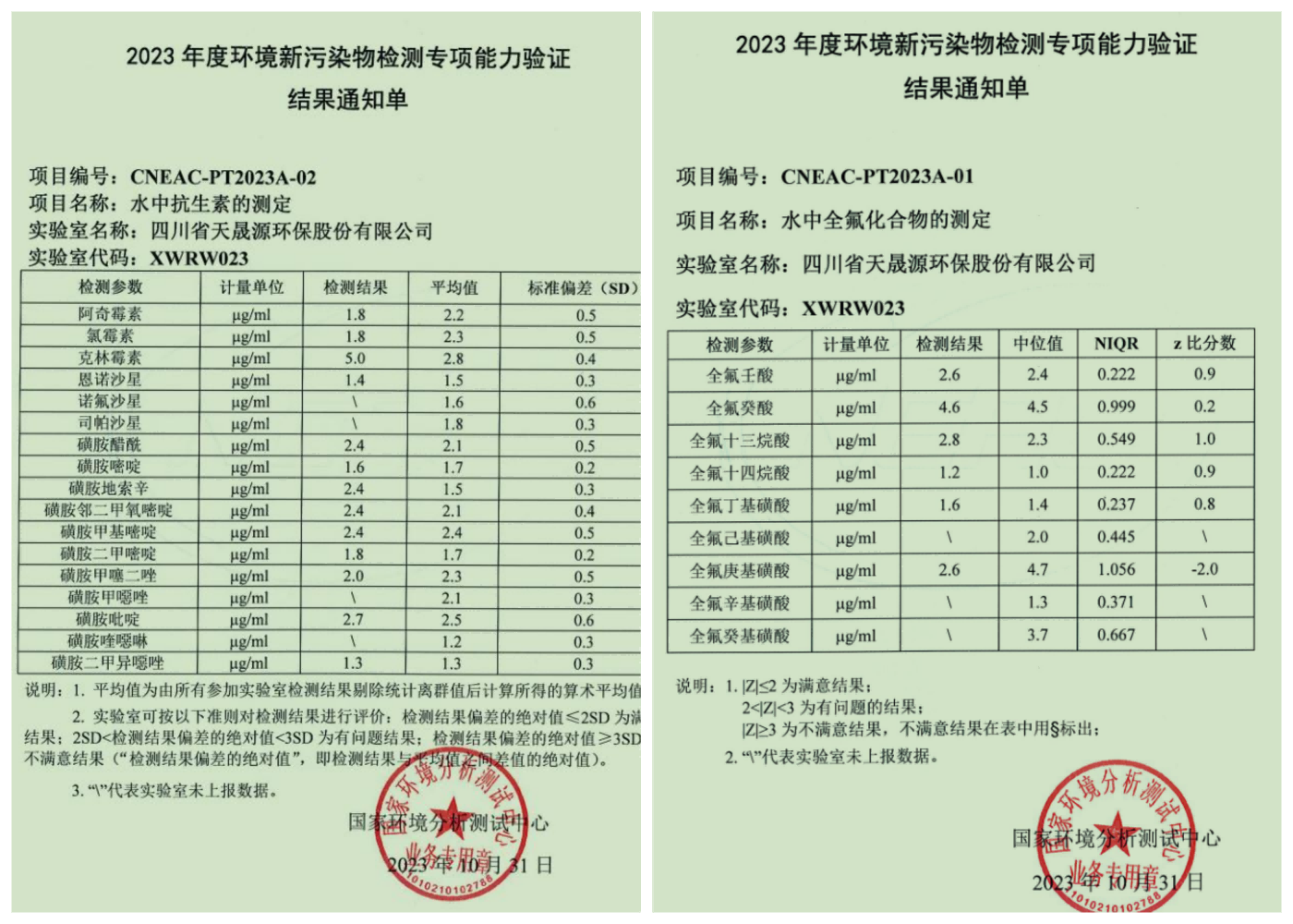 近日,四川省天晟源環(huán)保股份有限公司(以下簡(jiǎn)稱“天晟源環(huán)?!保┮詢?yōu)異的成績(jī)順利通過了生態(tài)環(huán)境部國(guó)家環(huán)境分析測(cè)試中心組織的“2023年度環(huán)境新污染物專項(xiàng)能力驗(yàn)證”,本次能力驗(yàn)證項(xiàng)目主要包括水中全氟化合物和抗生素。