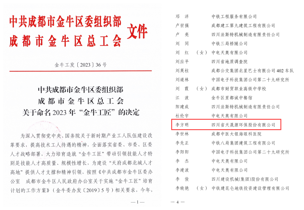 近日,中共成都市金牛區(qū)委組織部成都市金牛區(qū)總工會(huì)發(fā)布《關(guān)于命名2023年“金牛工匠”的決定》(金牛工發(fā)〔2023 ] 36號(hào)),四川省天晟源環(huán)保股份有限公司(簡稱“天晟源環(huán)?!保├罘矫鳂s獲“金牛工匠”榮譽(yù)稱號(hào)。