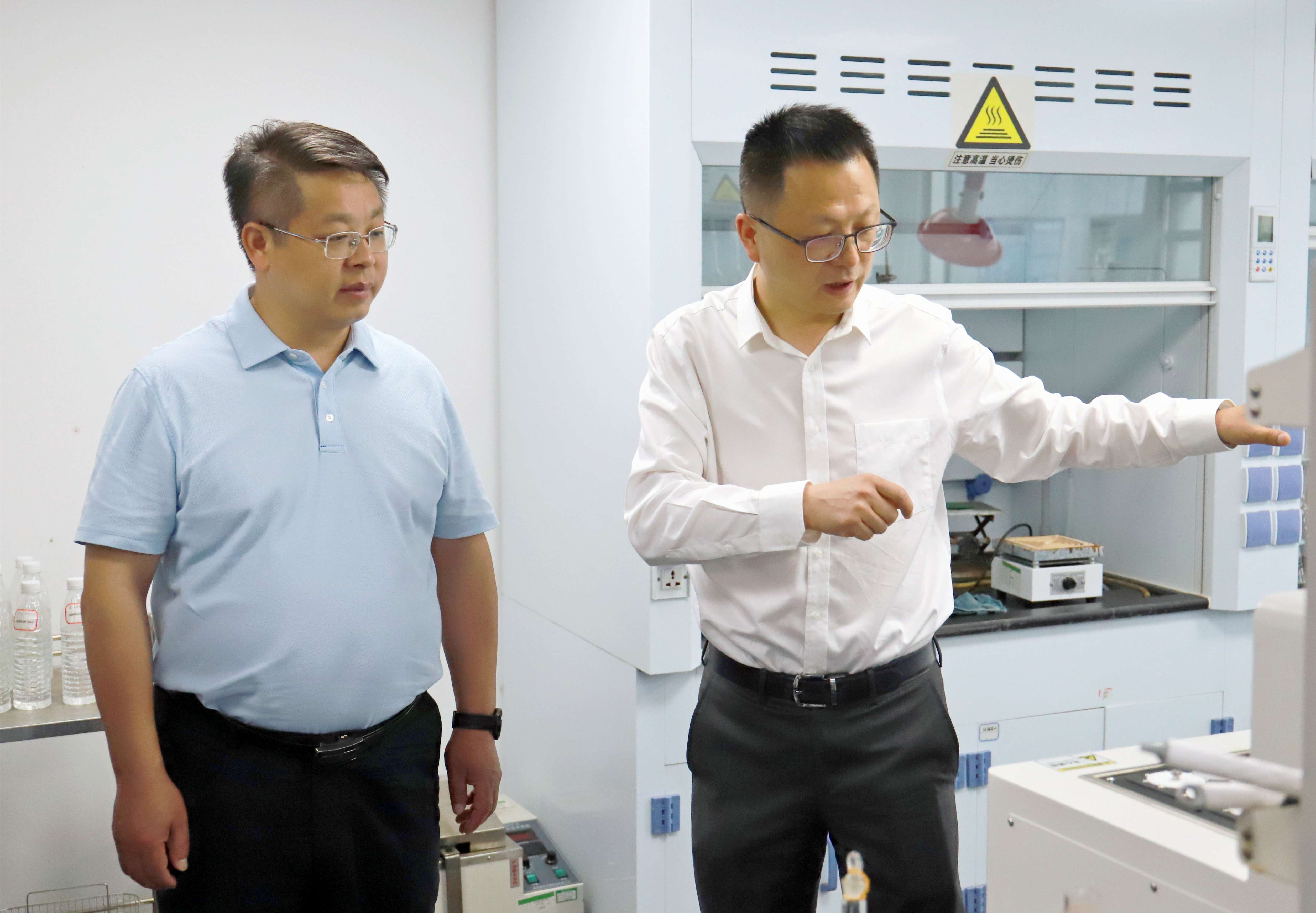 (張恒向王亮一行介紹實(shí)驗(yàn)室設(shè)備)