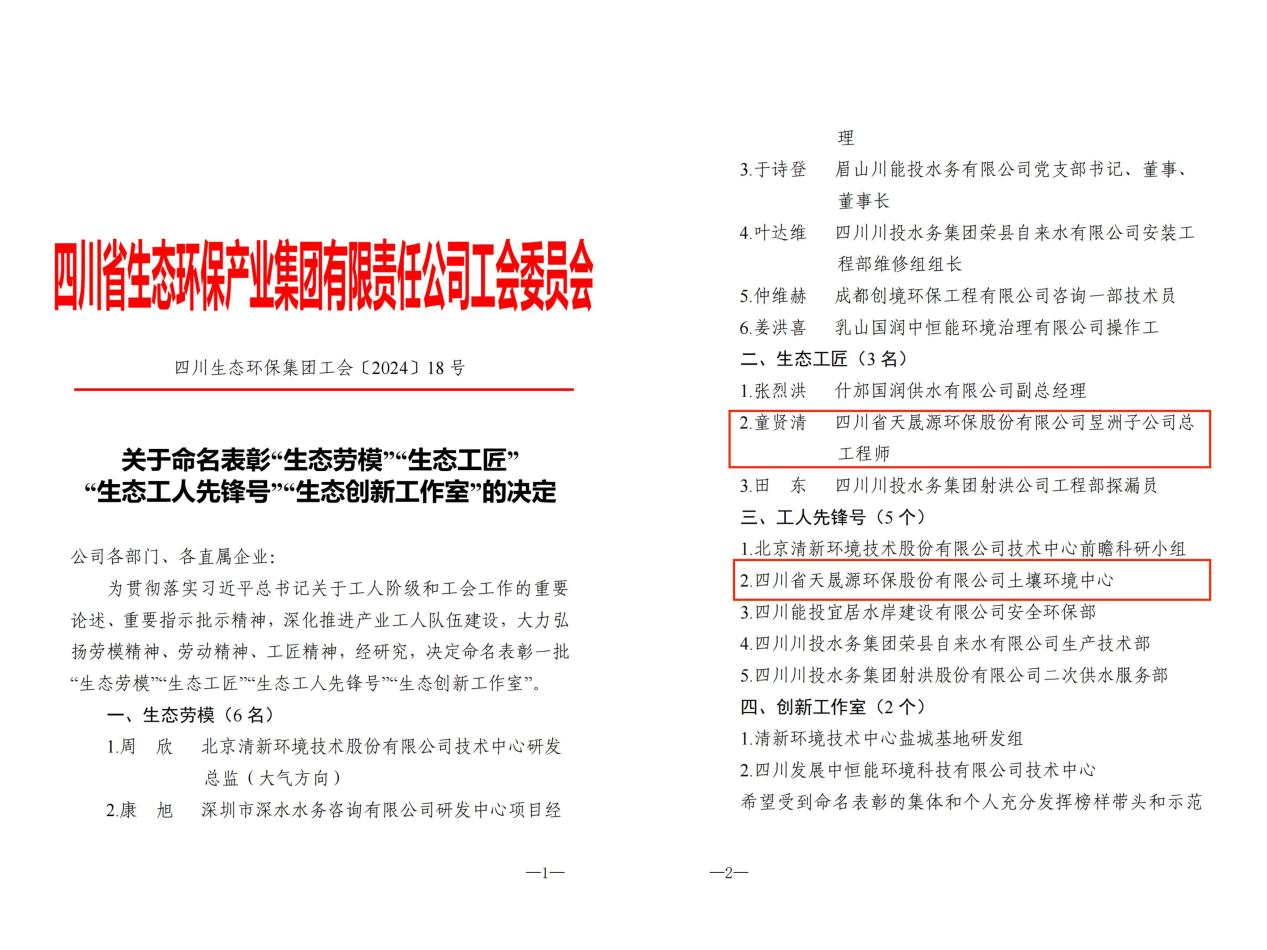 近日,四川省生態(tài)環(huán)保產(chǎn)業(yè)集團(tuán)有限責(zé)任公司工會(huì)委員會(huì)發(fā)布《關(guān)于命名表彰“生態(tài)勞?!薄吧鷳B(tài)工匠”“生態(tài)工人先鋒號(hào)”“生態(tài)創(chuàng)新工作室”的決定》(四川生態(tài)環(huán)保集團(tuán)工會(huì)〔2024〕18號(hào)),四川省天晟源環(huán)保股份有限公司(簡(jiǎn)稱:天晟源環(huán)保)土壤環(huán)境中心榮獲“工人先鋒號(hào)”榮譽(yù)稱號(hào),天晟源環(huán)保昱洲子公司總工程師童賢清榮獲“生態(tài)工匠”榮譽(yù)稱號(hào)。