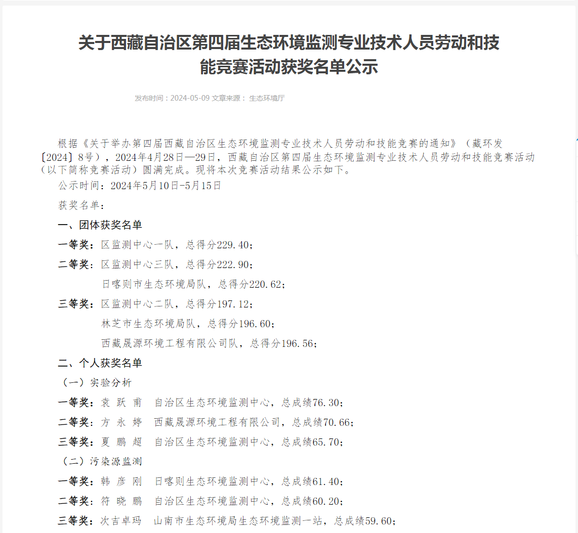 2024年59日,西藏自治區(qū)生態(tài)環(huán)境廳公布2024第四屆西藏自治區(qū)生態(tài)環(huán)境監(jiān)測專業(yè)技術(shù)人員勞動和技能競賽(簡稱“第四屆大比武”)獲獎名單,四川省天晟源環(huán)保股份有限公司子公司西藏晟源環(huán)境工程有限公司以下簡稱西藏晟源”)團體獎三等獎在第三方社會監(jiān)測機構(gòu)中名列第一,同時方永婷斬獲實驗分析組個人獎項二等獎。繼第三屆大比武獲獎后,西藏晟源在第四屆大比武中再創(chuàng)佳績,展現(xiàn)了西藏晟源西藏自治區(qū)區(qū)內(nèi)環(huán)境監(jiān)測領(lǐng)域的過硬實力。