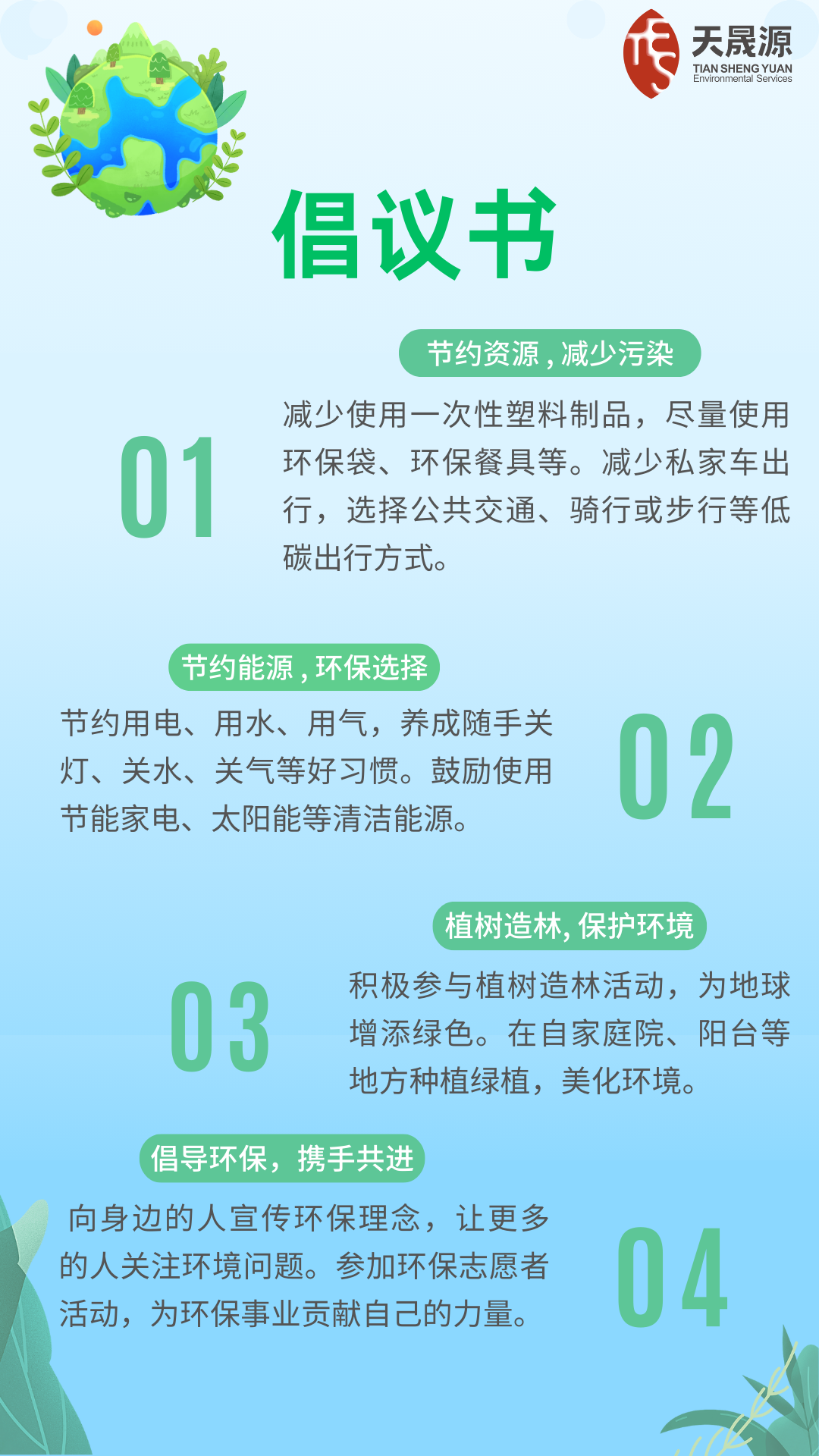 保護環(huán)境不僅是企業(yè)的責任,更是個人的責任,值此世界環(huán)境日之際,天晟源環(huán)保向全體員工及廣大公眾發(fā)出呼吁,從小事做起、從日常做起,共同為環(huán)境保護貢獻一份力量。具體倡議如下: