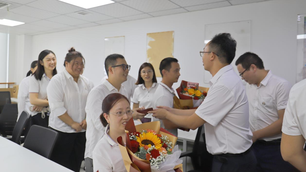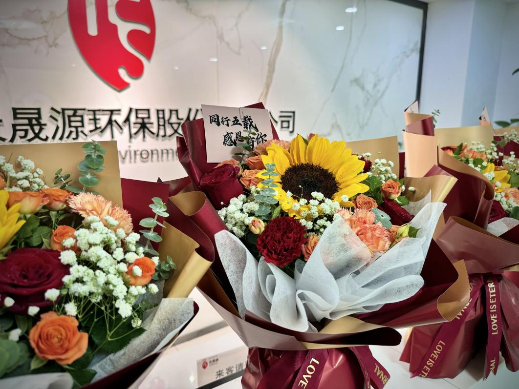 9月27日上午,天晟源環(huán)保主要領導李大有、張恒、姚夢代表公司向司齡滿九周年員工贈送與鮮花,向新滿五周年員工贈送紀念銀幣,一方面感謝他們的辛勤付出與忠誠堅守,另一方面勉勵他們再接再厲,在今后的工作中取得更好的成績。