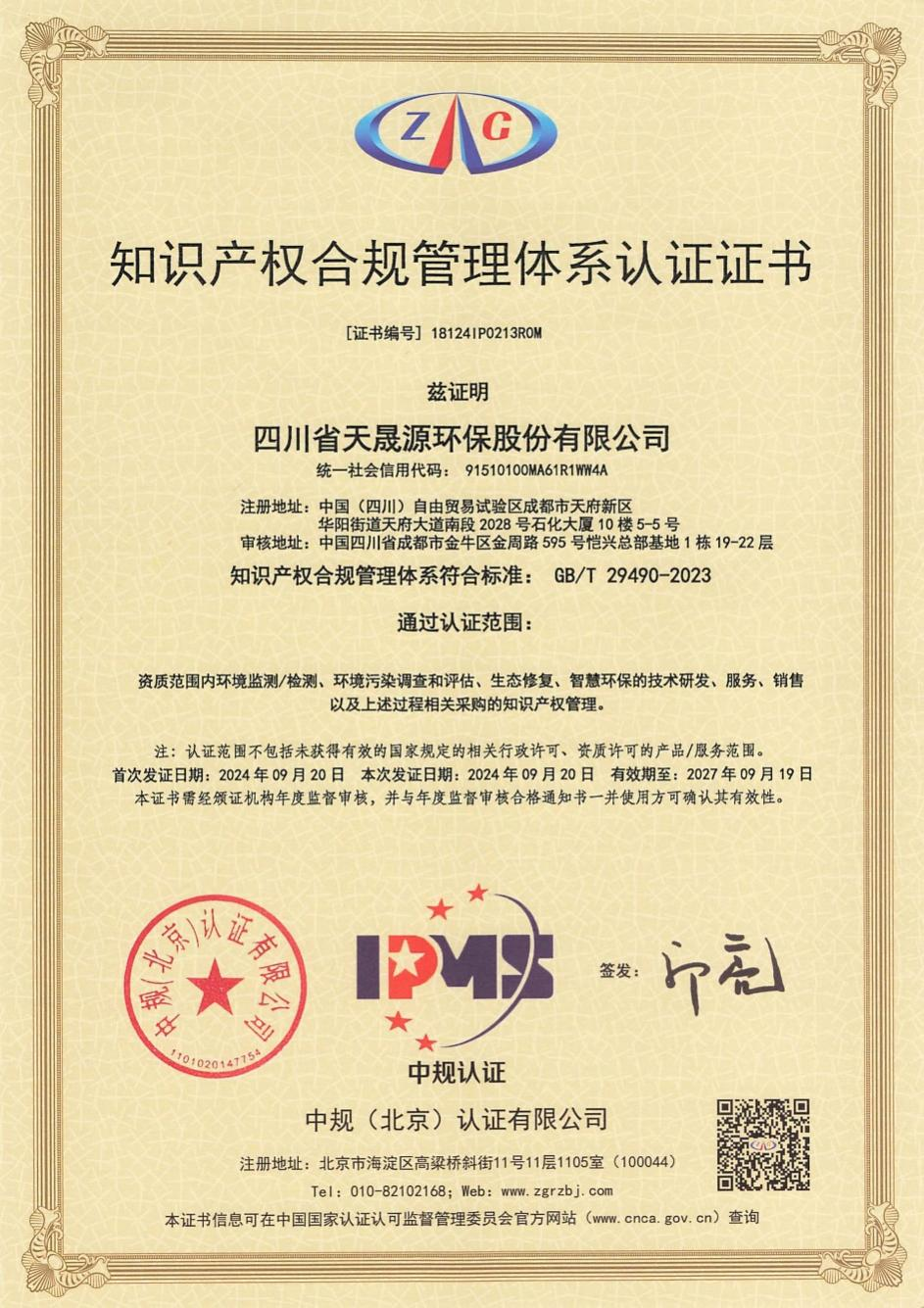 近日,四川省天晟源環(huán)保股份有限公司(簡稱“天晟源環(huán)?!保┏晒νㄟ^新頒布的國家標(biāo)準(zhǔn)《企業(yè)知識(shí)產(chǎn)權(quán)合規(guī)管理體系要求》(GB/T 29490-2023)認(rèn)證,并榮獲中規(guī)(北京)認(rèn)證有限公司頒發(fā)的知識(shí)產(chǎn)權(quán)合規(guī)管理體系認(rèn)證證書。